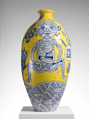 On this occasion, I enjoyed seeing the repetitive and highly skilled craftsmanship of creating and illustrating the giant pots that Grayson has made a hallmark of his career. I realise that he has actually worked to individually create each pot as his 3d canvas for his creative messages, which are themselves composed of multiple scenes and images. Often the connection is evident, but there are times when it eluded me - and then I could admire the detailed drawing or collage.